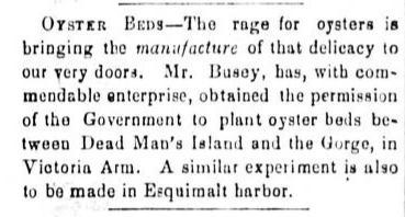 Surprisingly oyster farming comes very quickly in the colony, a Mr. Busey is reported to have received permission to plant beds in Gorge Harbour to satisfy the “rage for oysters” (British Colonist 1865.09.26 P. 2). A similar experiment is being started in Esquimalt Harbour.