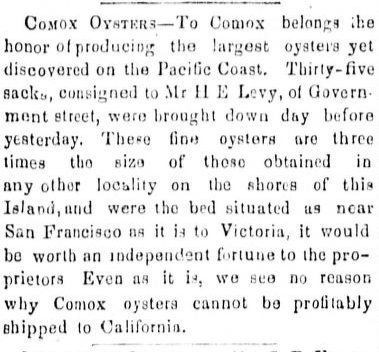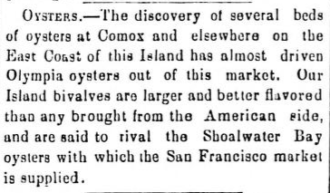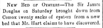 Beginning with the prize winning essay in a government sponsored contest that also notes the presence of larger supplies of oysters from Comox, written by Alexander C. Anderson who would go on to become Inspector for Fisheries of British Columbia.