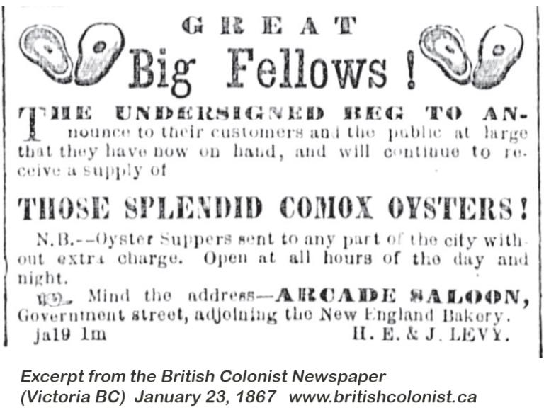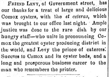 “Comox the greatest producing district in the world and Levy the Prince of Caterers. Success to Comox and its oyster beds and long and prosperous business career to the man who remembers the printer!”